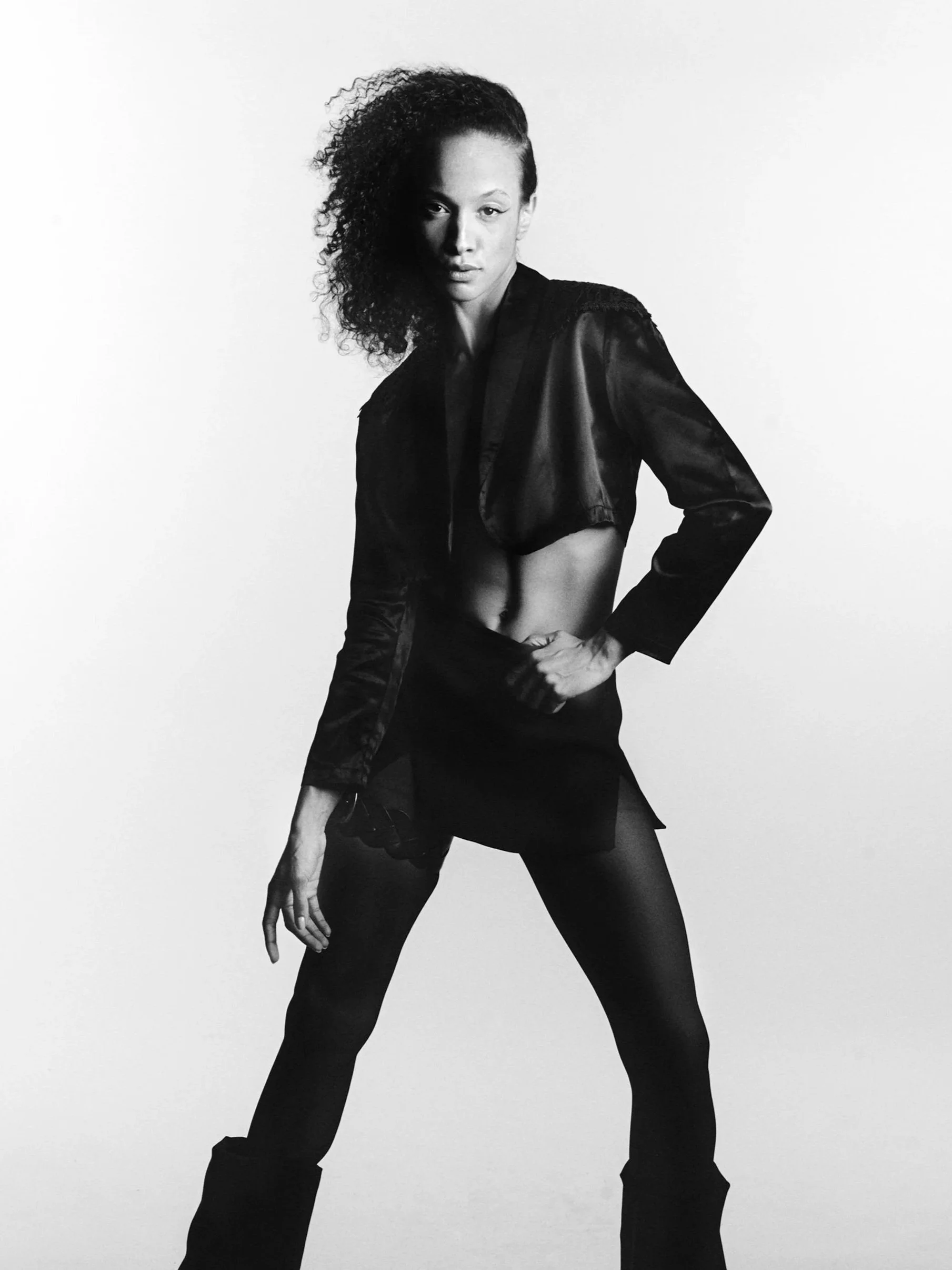Black and white photo of a person posing in a sheer outfit, wearing tights and boots, with curly hair.
