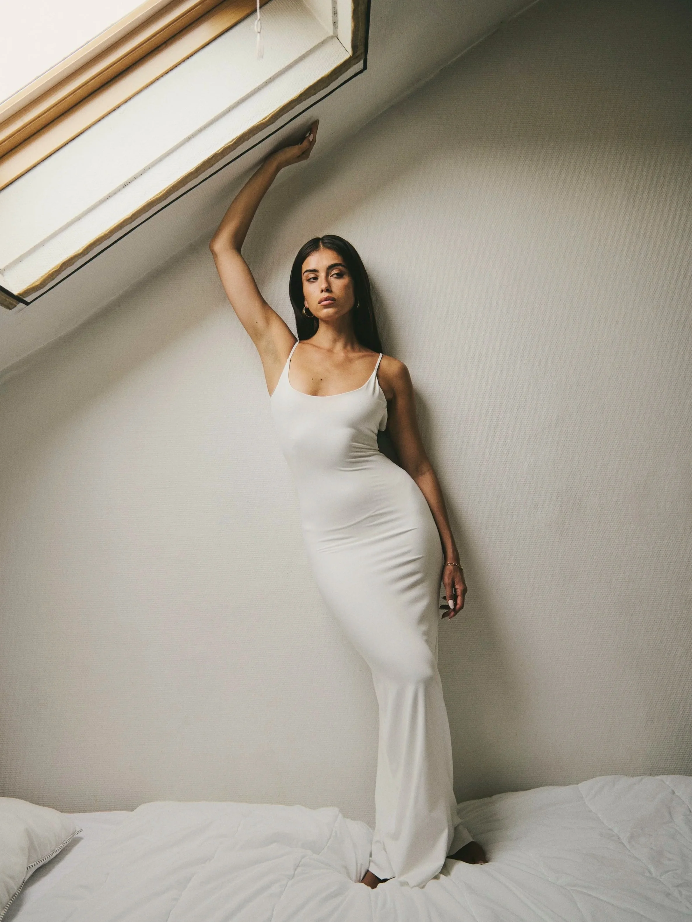Model in white suit with open blazer, captured by Belgium based fashion photographer GJ Verellen